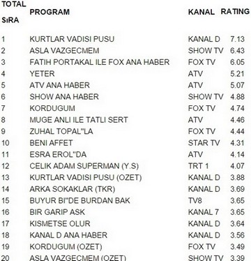 Kanal D ekranlarının en sevilen dizilerinden Kurtlar Vadisi Pusu 7.13 reytingle 11 Şubat perşembe gününün en çok izlenen programı oldu. Kurtlar Vadisi Pusu büyük bir başarıya imza atarak Asla Vazgeçmem‘i geride bıraktı. Show tv ekranlarının en çok izlenen dizisi Asla Vazgeçmem 6.43 reytingle ancak 2. olabildi. İlginçtir ki reytinglerde 3.lüğe ise 6.05 reytingle Fatih Portakal İle Fox Ana Haber yerleşti.