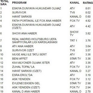 Atv ekranlarında yayınlanan Eşkiya Dünyaya Hükümdar Olmaz 8.61 reytingle 12 Nisan Salı gününün en çok izlenen programı oldu. Eşkiya Dünyaya Hükümdar Olmaz büyük bir başarıya imza atarak Survivor’ı geride bıraktı. Survivor 8.02 reytingle ancak 2. olabildi. İlginçtir ki reytinglerde 3.lüğe ise 5.60 reytingle Hayat Şarkısı yerleşti.
