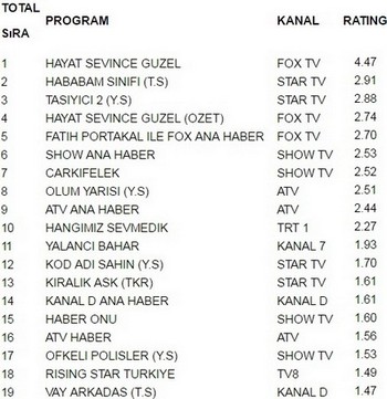 Fox tv ekranlarında yayınlanan Hayat Sevince Güzel 4.47 reytingle 15 ağustos pazartesi günü en çok izlenen programı oldu. Hayat Sevince Güzel büyük bir başarıya imza atarak Hababam Sınıfı geride bıraktı. Hababam Sınıfı 2.91 reytingle ancak 2. olabildi. İlginçtir ki reytinglerde 3.lüğe ise 2.88 reytingle Taşıyıcı 2 yerleşti.