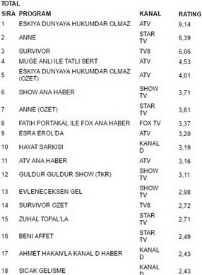 Atv ekranlarında yayınlanan Eşkiya Dünyaya Hükümdar Olmaz 9.14 reytingle 16 mayıs salı günü en çok izlenen program oldu. Eşkiya Dünyaya Hükümdar Olmaz büyük bir başarıya imza atarak star tv ekranlarında yayınlanan Anne tahtından etti. Anne 6.39 reyting oranıyla 2. olurken. İlginçtir ki reytinglerde 3.lüğe ise 6.06 reytingle Survivor yerleşti.
