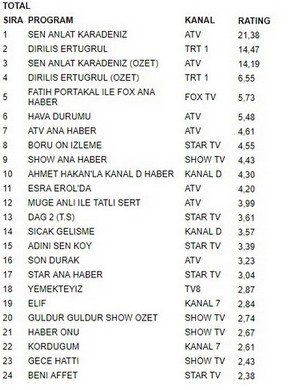Atv ekranlarında yayınlanan Sen Anlat Karadeniz 21 şubat çarşamba akşamı aldığı 21.38 reytingle en çok izlenen program oldu. Sen Anlat Karadeniz büyük bir başarıya imza atarak Trt 1 ekranlarında yayınlanan Diriliş Ertuğrul’u geçmeyi başardı.Diriliş Ertuğrul 14.47 reyting oranıyla 2. olurken. İlginçtir ki reytinglerde 3.lüğe ise 13.19 oranla Sen Anlat Karadeniz Özet yerleşti.