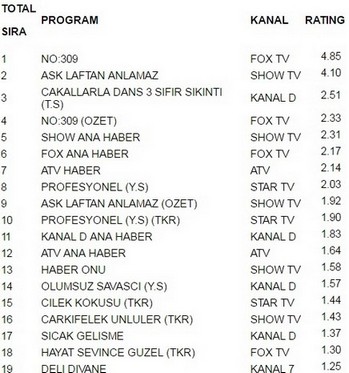Fox tv ekranlarında yayınlanan No 309 4.85 reytingle 27 temmuz çarşamba günü en çok izlenen programı oldu. No 309 bir başarıya imza atarak Aşk Laftan Anlamaz’ı geride bıraktı. Aşk Laftan Anlamaz 4.10 reytingle ancak 2. olabildi. İlginçtir ki reytinglerde 3.lüğe ise 2.51 reytingle Çakallarla Dans 3 Sıfır Sıkıntı yerleşti.