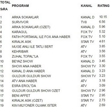 Kanal D ekranlarında yayınlanan Arka Sokaklar 10.15 reytingle 6 Mayıs Cuma günü en çok izlenen programı oldu. Arka Sokaklar büyük bir başarıya imza atarak Survivor’u geride bıraktı. Survivor 6.56 reytingle ancak 2. olabildi. İlginçtir ki reytinglerde 3.lüğe ise 5.96 reytingle Arka Sokaklar (Özet) yerleşti.