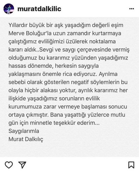 Uzun süredir ayrılıp ayrılmayacakları gündemde olan sosyal medyada büyük yankı bulan Dalkılıç çiftinden kötü haber geldi. Yaşadıkları büyük aşkla evlenen Murat Dalkılıç ve Merve Boluğur boşanmaktan kurtulamadı. Murat Dalkılıç instagram hesabından boşandıklarını şu şekilde açıklarken evliliklerini bir türlü kurtaramadıklarını ifade etti;