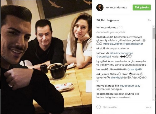 Ünlü internet fenomeni Kerimcan Durmaz Acun Ilıcalı ile birlikte aynı masada oturdu. Tv8 kanalının sahibi Acun Ilıcalı sosyal medya fenomeni Kerimcan Durmaz’la bir akşam yemeği yedi. İkilinin sürpriz buluşmasında tabiki yeni bir proje planı ortaya çıktı. Acun Ilıcalı düşen tv8 reytingleri ve piyasa değerini kurtarmak için yeni sezonda Survovr 2017 için sağlam bir ünlüler kadrosu kurmayı planlıyor. Survivor 2017‘de ünlüler takımında çok farklı isimleri en doğal halleriyle izleyici karşısına çıkarmayı planlayan Acun Ilıcalı 1.000.000’dan fazla takipçisi olan ve DJ performansı ile de dillere destan bir ismi Kerimcan Durmaz ‘ı Survivor 2017’nin kadrosuna kattı.